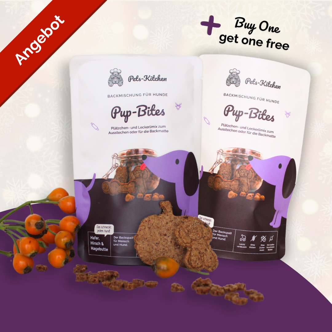 Die Pup-Bites-Backmischung kann in einer Backmatte, aber auch zum Ausstechen von Plätzchen verwendet werden. Der Mix besteht aus Hafer, Hirsch, Hagebutte und Flohsamenschalen und ist damit nicht nur lecker, sondern auch gesund. Selbstverständlich verzichten wir auf Weizen, Zucker und unnötige Inhaltsstoffe.